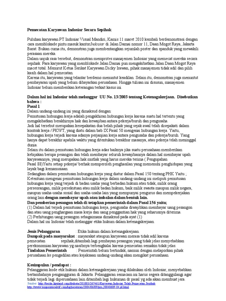 Pemecatan Karyawan Indosiar Secara Sepihak Pdf